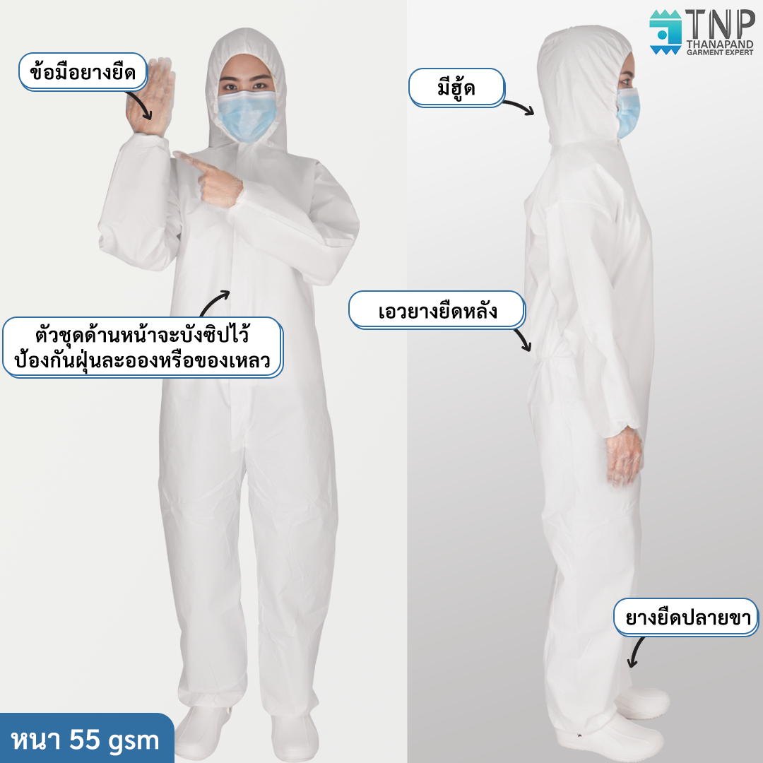 ชุดป้องกันเชื้อโรค ชุดป้องกันฝุ่นละออง ชุด PPE Coverall Suit จั๊มปลายแขนและขา แบบคลุมทั้งตัวมีน้ำหนักเบามาก เคลื่อนไหวได้ง่าย
