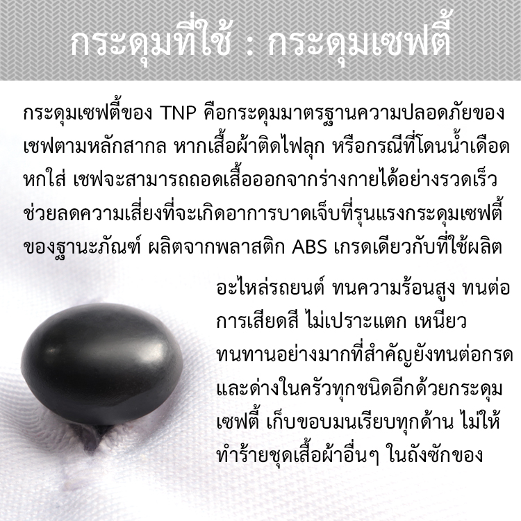 กระดุมเซฟตี้ ( กระดุมที่สามารถดึงออกได้ทันทีหากเกิดอุบัติเหตุจากไฟไหม้เสื้อผ้า) เนื้อผ้าเกรด A มีการตัดเย็บประณีต สามารถระบายอากาศได้ดีเมื่อสวมใส่แล้วจะไม่รู้สึกร้อนและช่วยให้ทำงานได้อย่างคล่องแคล่วและสบายตัว