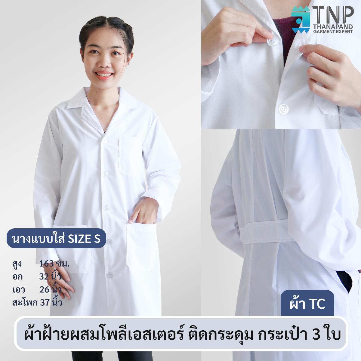 เสื้อกาวน์แขนยาว มีกระเป๋า 3 ใบ มีช่องสำหรับล้วงกระเป๋าทั้ง 2 ข้าง มีอินธนูด้านหลัง