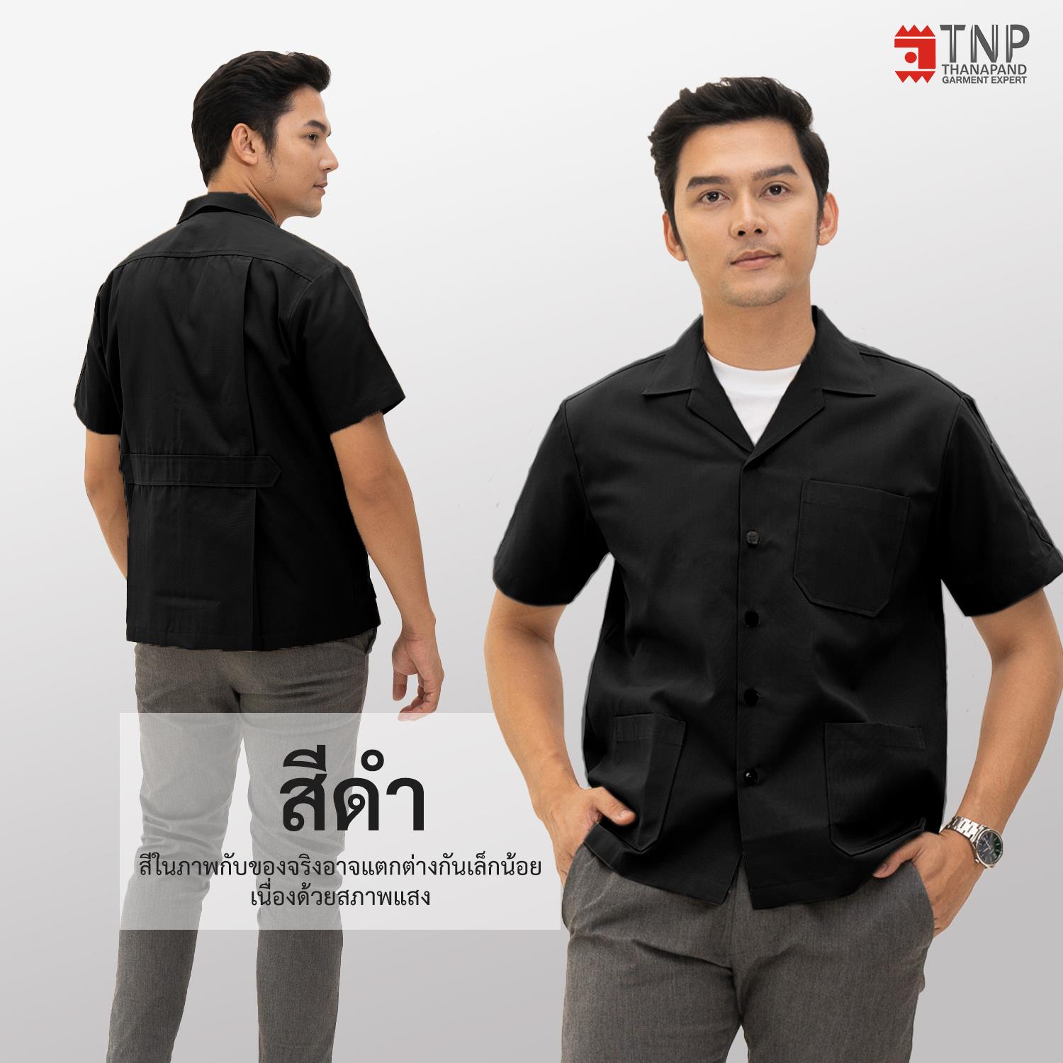 เสื้อแขนสั้น คอปกฮาวาย มีกระเป๋า 3 ใบ มีที่เสียบปากแขนซ้าย ด้านหลังมีอินธนู